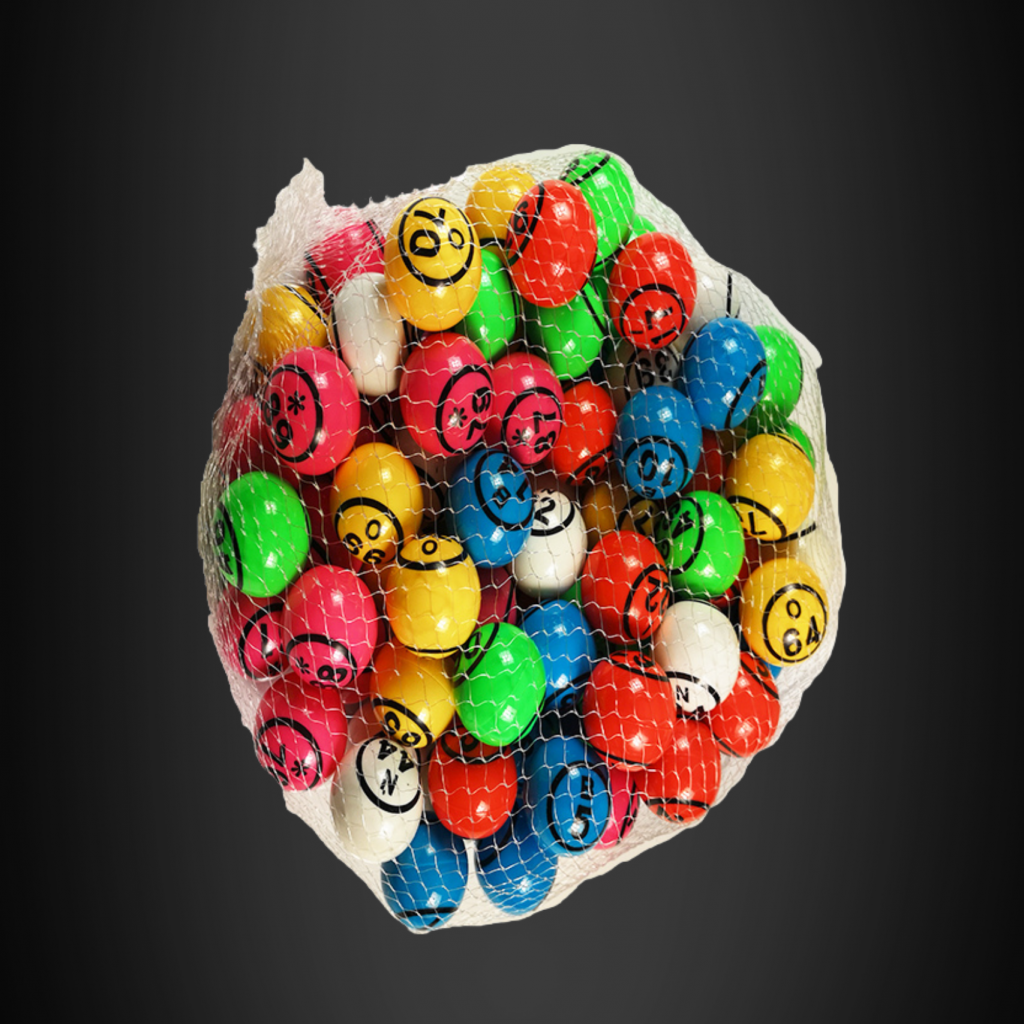 - Large: 90 numbered 1-90 38mm multi-coloured plastic balls